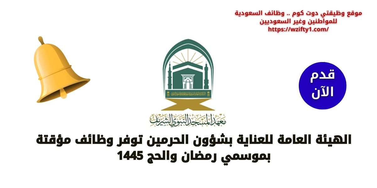 الهيئة العامة للعناية بشؤون الحرمين توفر مجموعة من الوظائف المؤقتة لموسمين رمضان والحج 1445 للجنسين (الرجال – النساء) في المسجد الحرام و المسجد النبوي، وإليكم تفاصيل الوظائف ومتطلبات القبول فيها من خلال الآتي: